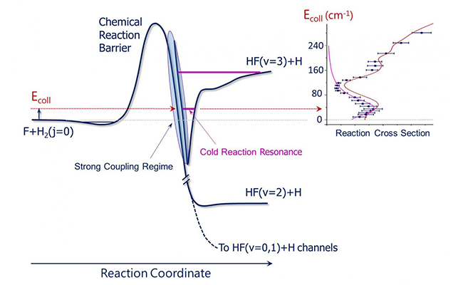 文章還介紹了大連化物所關于研究接近絕對零度下量子散射共振在化學反應中發(fā)揮重要作用的例子。F+H2HF+H反應是星際化學中產生HF分子的重要過程。但是F+H2反應具有1.8 kcal/mol高度的勢壘,經典模型下在接近絕對零度時這個反應幾率是完全可以忽略的。楊學明團隊通過對現(xiàn)有H原子里德堡態(tài)標示時間飛渡譜的交叉分子束裝置進行了顯著改進,觀測到了反應溫度低至14開爾文時此反應仍然發(fā)生的證據(jù),同時觀測到了約40 cm-1碰撞能的一個反應共振峰。進一步理論分析表明,F(xiàn)+H2在低溫時的反應性,是通過反應共振態(tài)所增強的隧穿效應而產生的,而不是通常簡單的隧穿效應,這也是在接近絕對零度下此反應仍然可以發(fā)生的原因。如果將共振態(tài)所導致的共振增強效應移除,F(xiàn)+H2(v=0,j=0)在10 K溫度以下的反應速率常數(shù),會降低3個數(shù)量級以上。