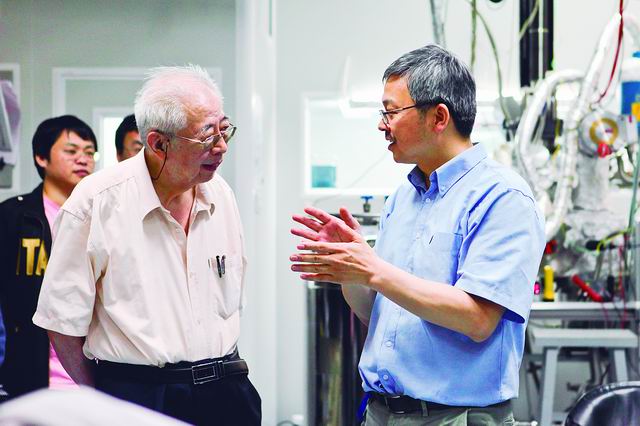 ③2012年6月8日,張存浩先生與時(shí)任分子反應(yīng)動(dòng)力學(xué)國(guó)家重點(diǎn)實(shí)驗(yàn)室主任楊學(xué)明在實(shí)驗(yàn)室討論問(wèn)題