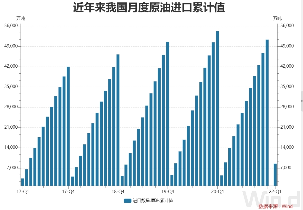 如圖所示,除2021年以外,近年來(lái)我國(guó)原油進(jìn)口均呈現(xiàn)逐年升高的趨勢(shì)