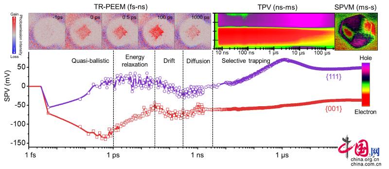 李燦介紹,通過集成結(jié)合多種先進(jìn)的表征技術(shù)和理論模擬,包括時間分辨光發(fā)射電子顯微鏡(飛秒到納秒)、瞬態(tài)表面光電壓光譜(納秒到微秒)和表面光電壓顯微鏡(微秒到秒)等,像接力賽一樣,第一次在一個光催化劑顆粒中跟蹤電子和空穴到達(dá)表面反應(yīng)中心的整個機制。