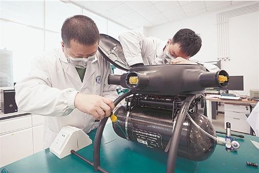 該團隊研發(fā)的高比能氫混動力電源比能量達每千克600瓦時,其適配的無人機在零下7℃、風(fēng)力5級的室外環(huán)境下試飛,燃料電池穩(wěn)定輸出2030瓦。動力電源是工業(yè)級無人機的心臟,決定了工業(yè)級無人機的續(xù)航時間和作業(yè)效率。高比能氫混動力電源具有比能量高、可靠性高、寬溫域等優(yōu)點,適配工業(yè)級無人機,可有效解決工業(yè)級無人機續(xù)航時間短的瓶頸問題。 新華社記者潘昱龍 攝