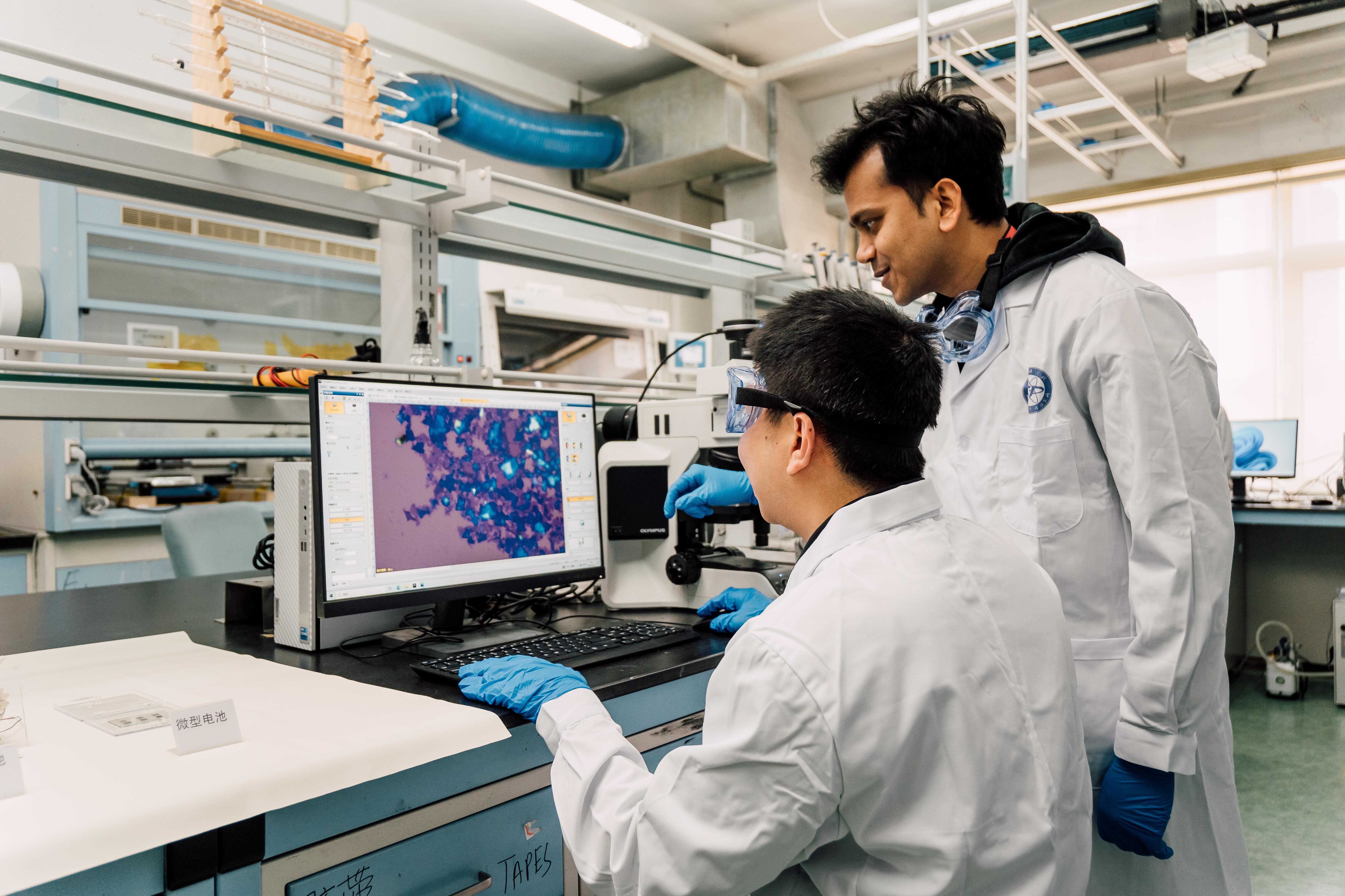科研人員用光學(xué)顯微鏡觀察制備的過渡金屬碲化物納米片。 受訪單位供圖