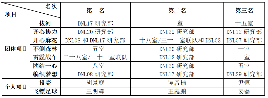 最后,所工會(huì)文體委員會(huì)主任、DNL08部長(zhǎng)田志堅(jiān)研究員宣讀比賽成績(jī),DNL17、DNL20、十五室和DNL08分別獲得團(tuán)體總分第一名、第二名和并列第三名,王明輝為他們頒發(fā)了獎(jiǎng)杯。