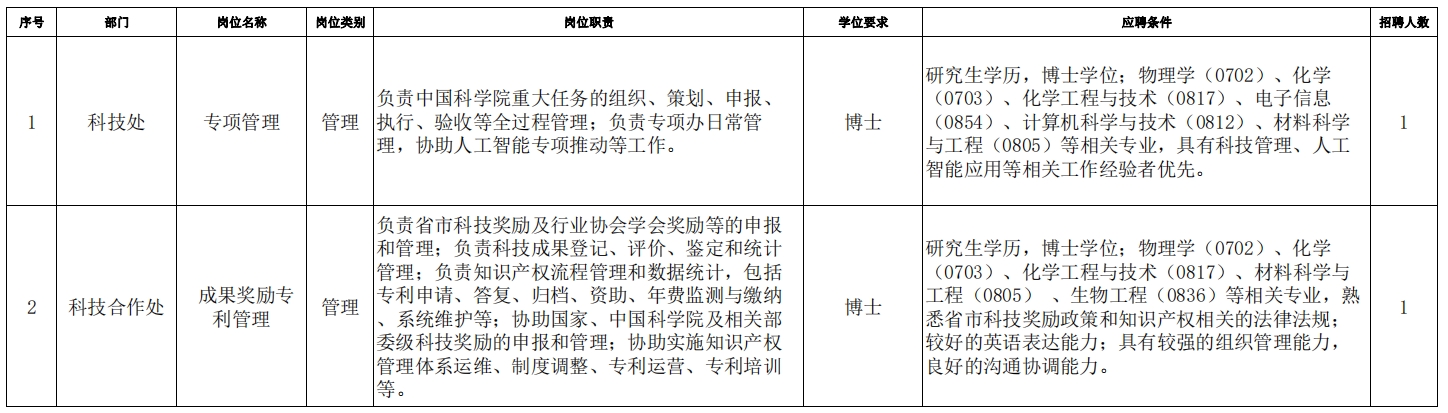 中國(guó)科學(xué)院大連化學(xué)物理研究所本著“按需設(shè)崗、公開招聘、競(jìng)爭(zhēng)上崗、擇優(yōu)聘用”的原則,根據(jù)《大連化物所事業(yè)編制工作人員招聘實(shí)施細(xì)則(試行)》有關(guān)要求,現(xiàn)面向社會(huì)公開招聘職能部門工作人員2名,具體信息如下: