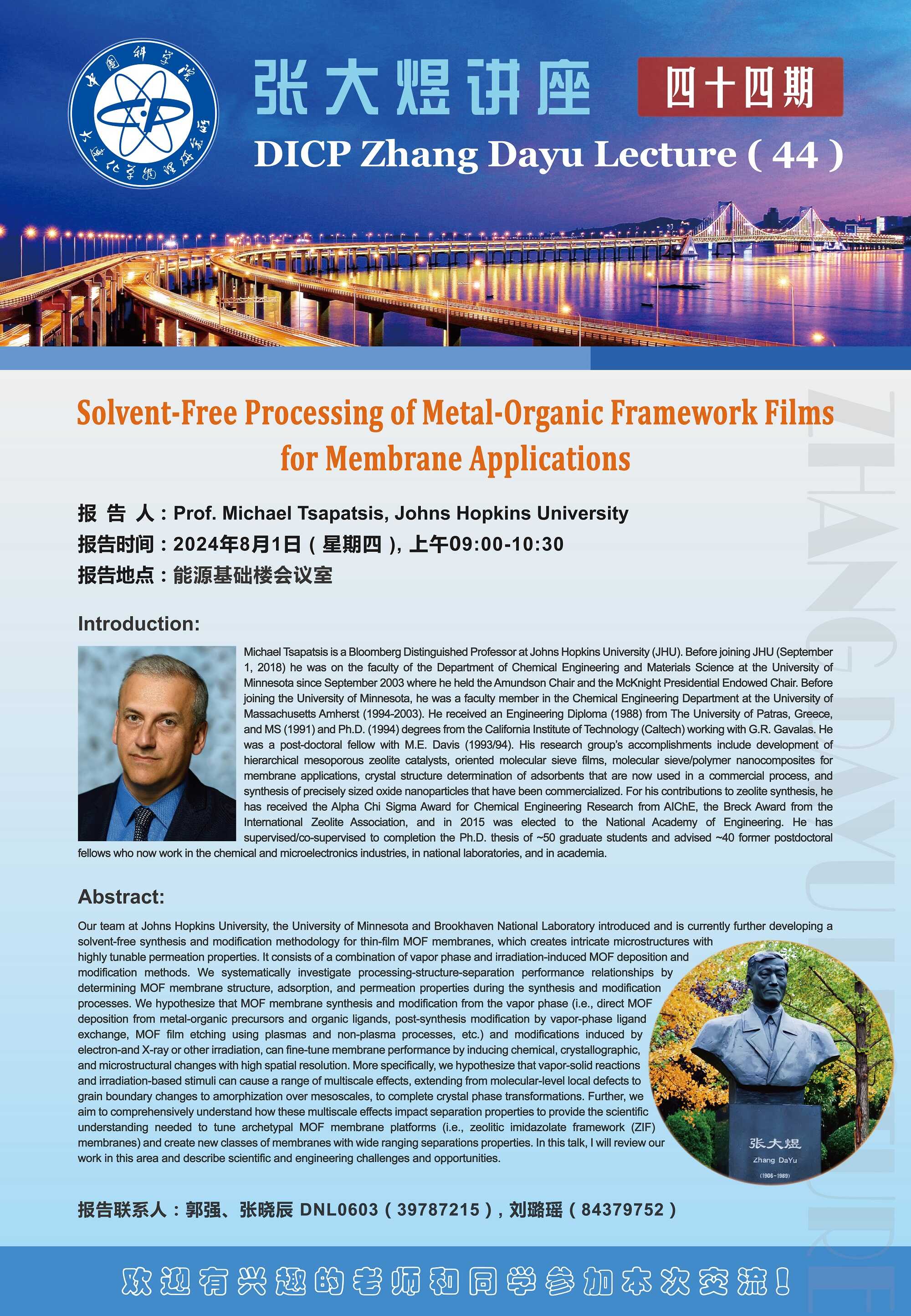 第四十四期張大煜講座將于8月1日(星期四)9:00至10:30在能源基礎樓會議室舉行,本期報告人是Michael Tsapatsis教授(Johns Hopkins University),報告主題為Solvent-Free Processing of Metal-Organic Framework Films for Membrane Applications。歡迎參加!