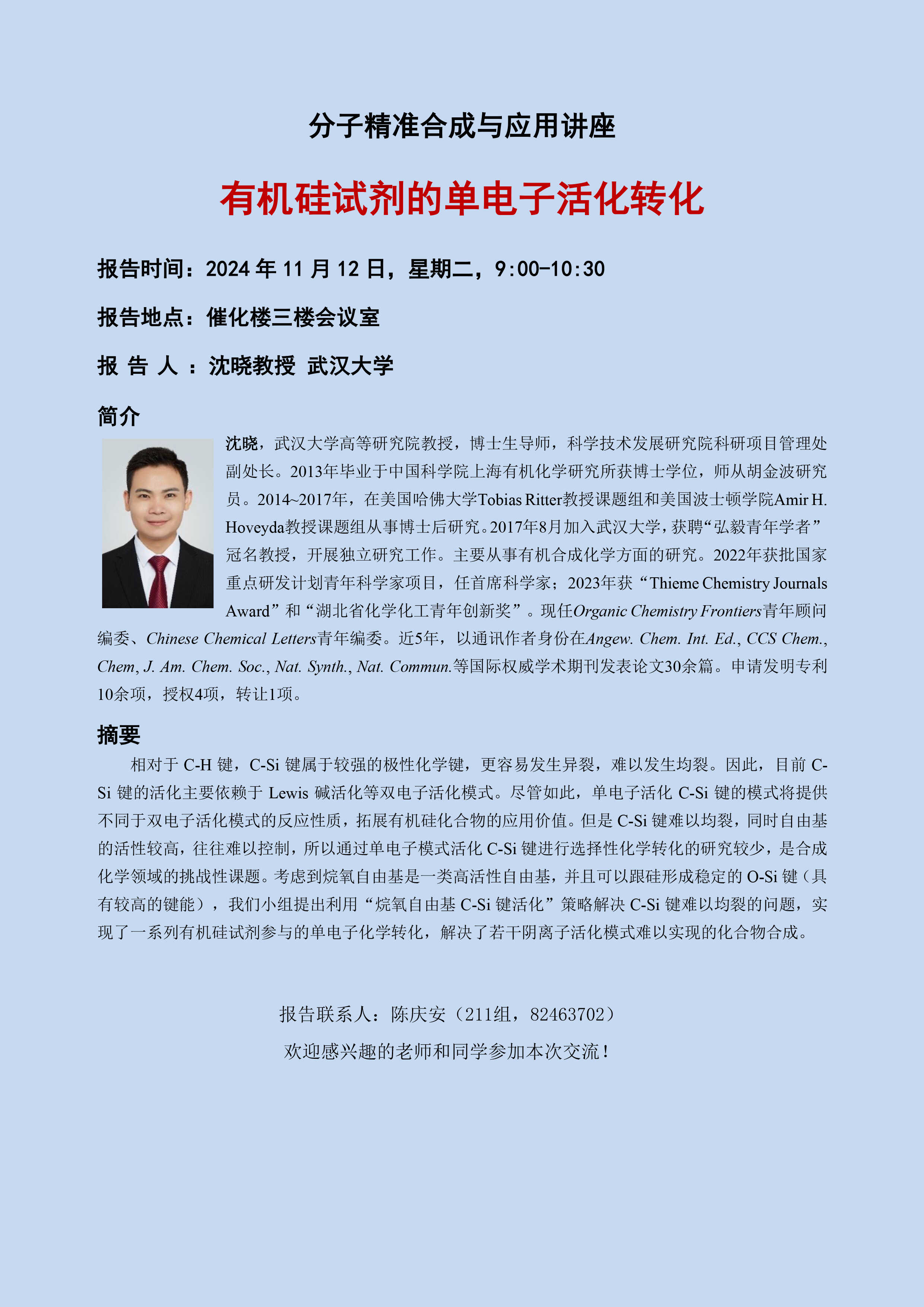 關(guān)于舉行“有機硅試劑的單電子活化轉(zhuǎn)化”學(xué)術(shù)報告會的通知