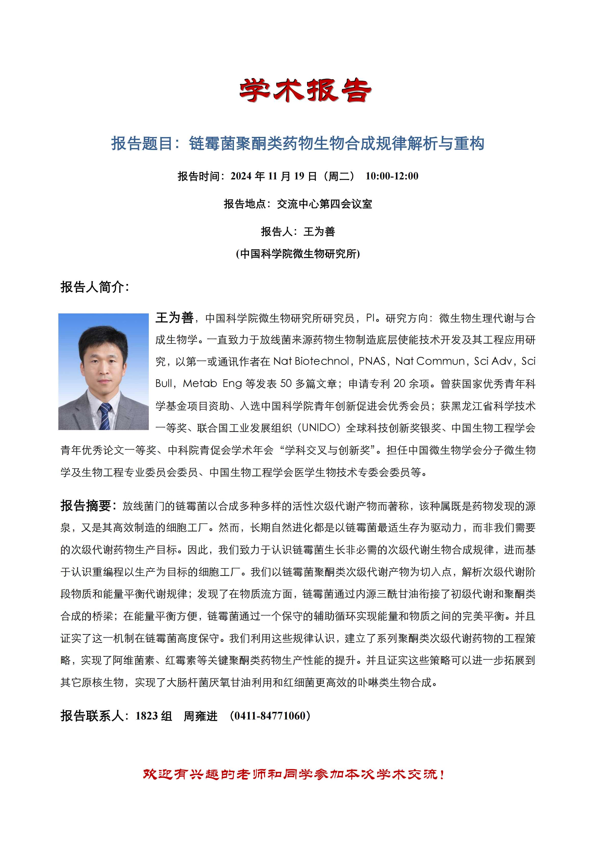 關(guān)于舉行“鏈霉菌聚酮類(lèi)藥物生物合成規(guī)律解析與重構(gòu)”學(xué)術(shù)報(bào)告會(huì)的通知