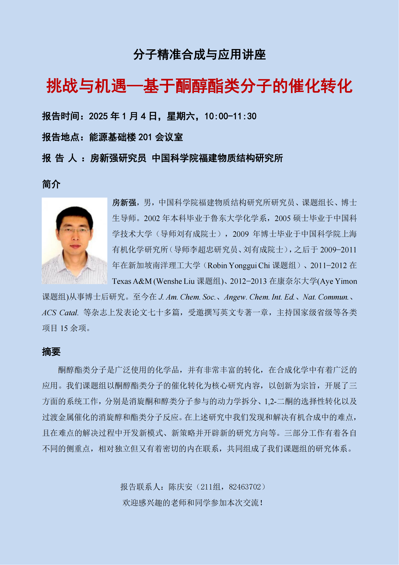關(guān)于舉行分子精準合成與應(yīng)用講座“挑戰(zhàn)與機遇——基于酮醇酯類分子的催化轉(zhuǎn)化”的通知
