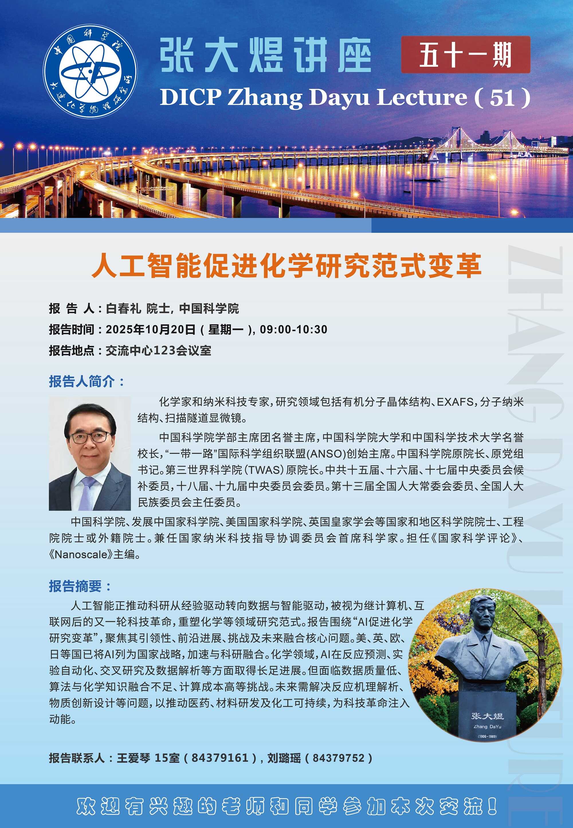 關(guān)于舉行“第51期張大煜講座——人工智能促進(jìn)化學(xué)研究范式變革”的通知